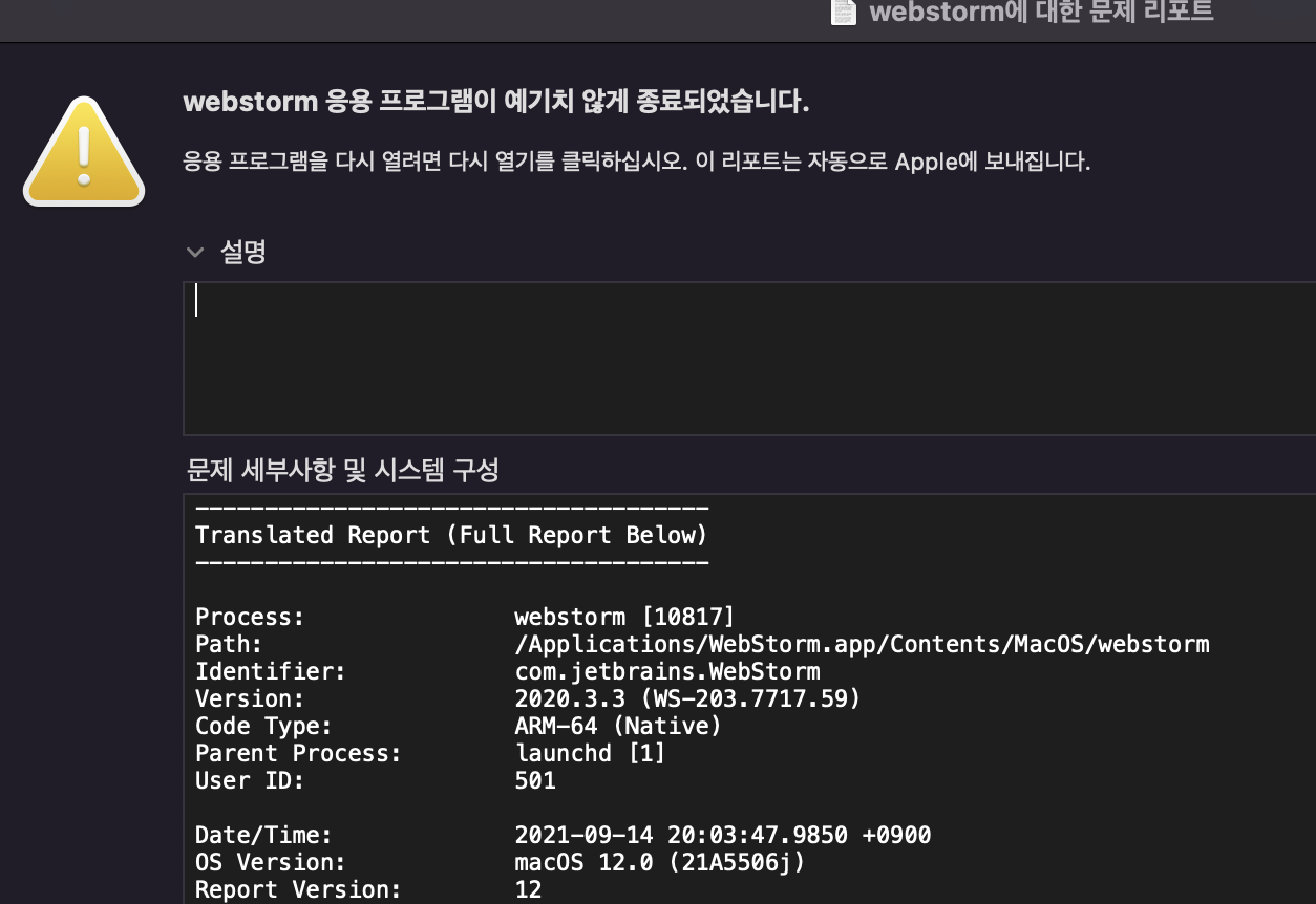 Mac OS 12 베타 버전을 사용중인데, Beta6 에서는 Jetbrain의 Tool에서 아래와 같은 오류가 발생한다.