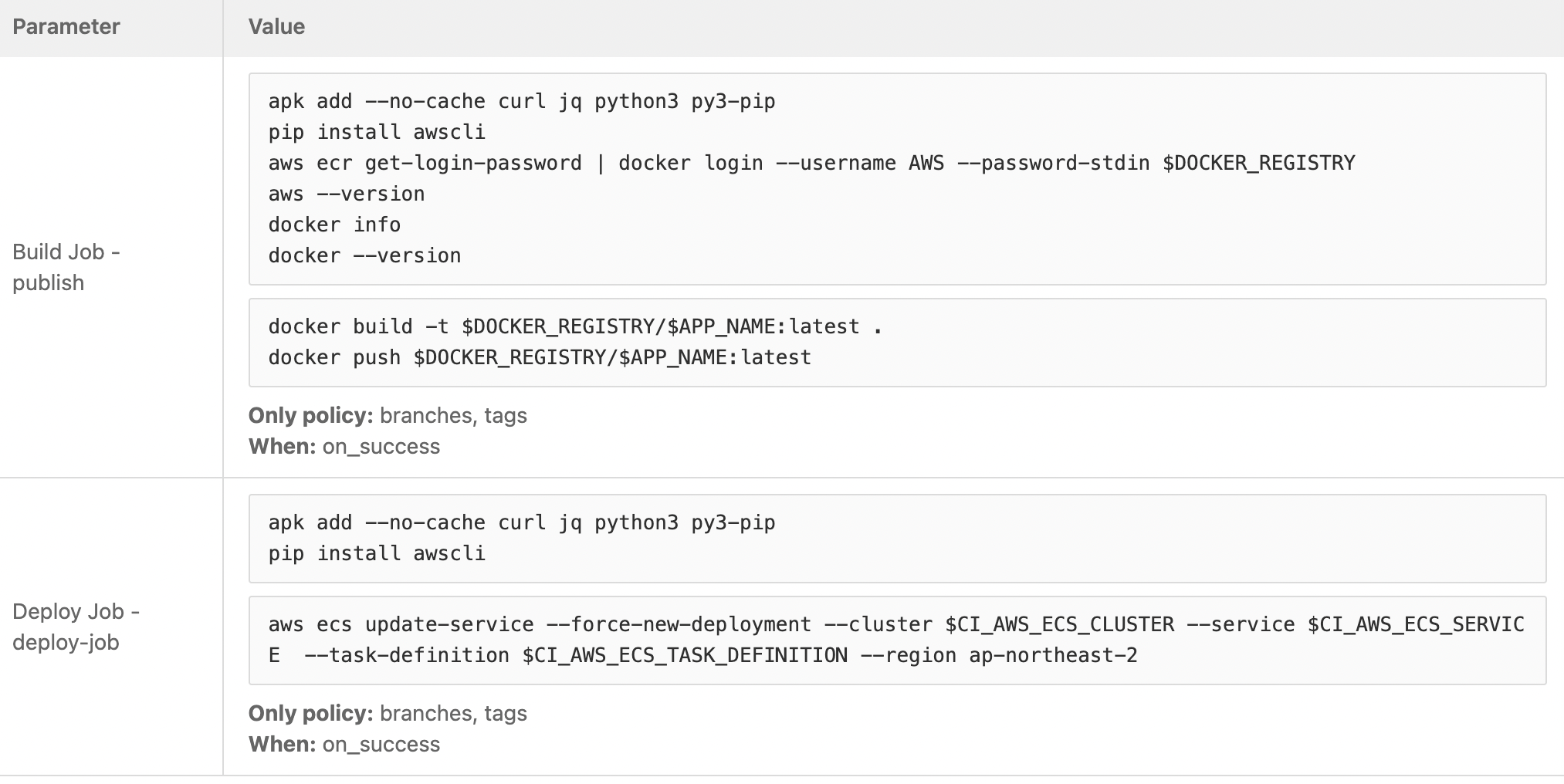 어쨌든 git에 commit되는 것을 체크해야하니 Gitlab의 기능을 살펴보았고 AWS와 연동이 가능한 template을 제공하고 있음을 확인했다. 물론 template의 세부적인 command flow는 직접 구현해야하지만, 그래도 완전 새로 구현하는것보다는 훨씬 편하게 진행했다.